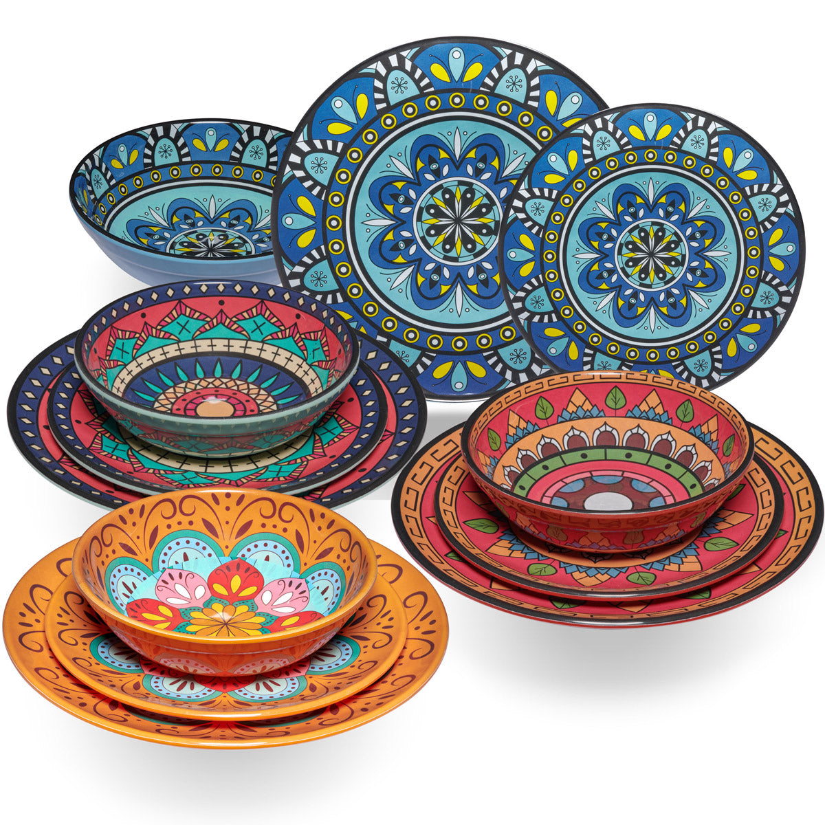 Melamin Geschirr Set Toskana für 4 Personen - 12 Teile - BUNT - Mandala-Optik Essgeschirr Campinggeschirr