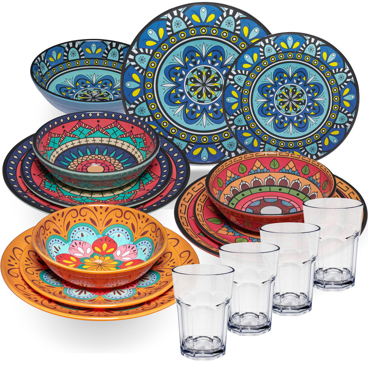 Melamin Geschirr Set Toskana für 4 Personen - 16 Teile - BUNT - Mandala-Optik mit klaren Trinkgläsern 400 ml aus Acryl Campinggeschirr