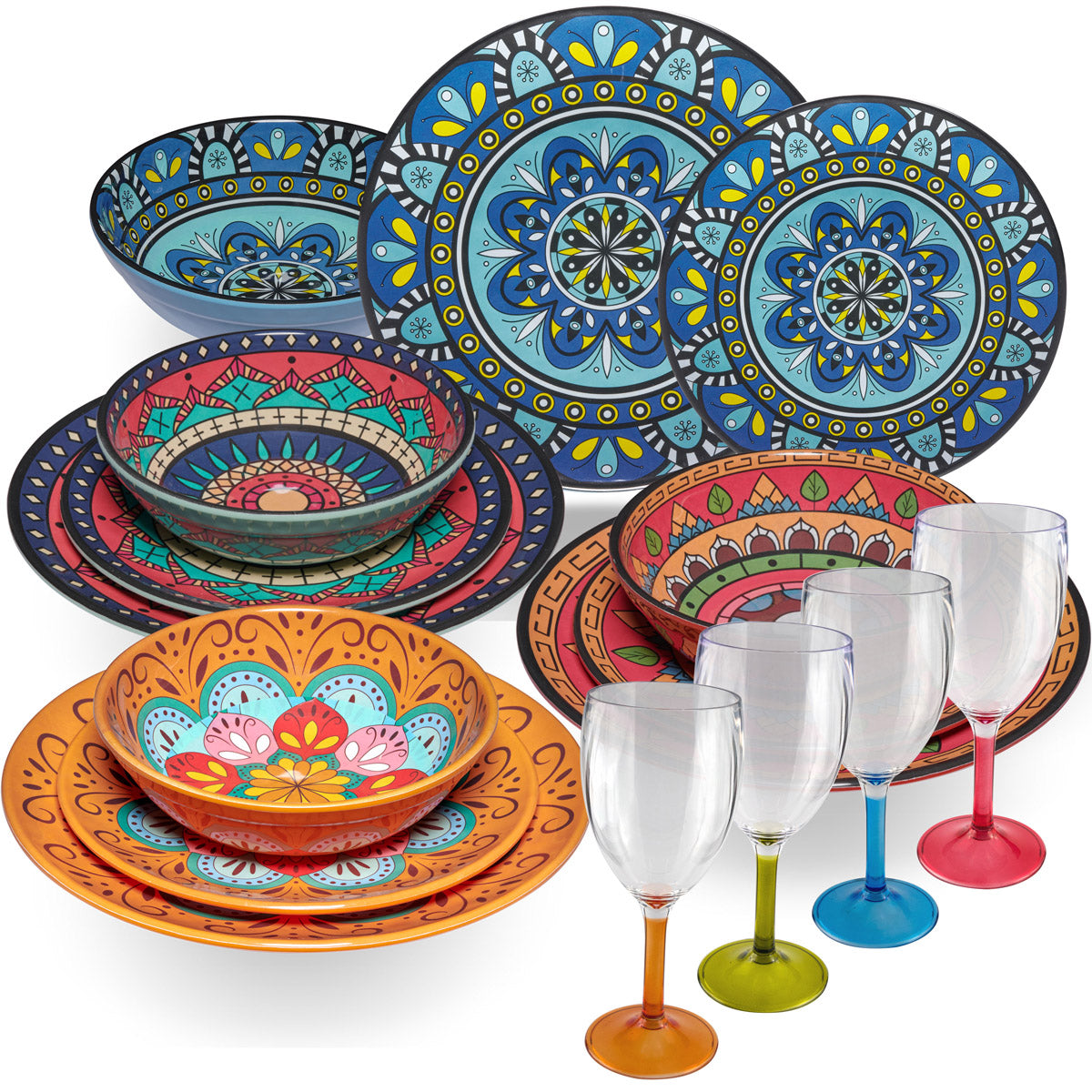 Melamin Geschirr Set Toskana für 4 Personen - 16 Teile - BUNT - Mandala-Optik mit farblich passenden Weingläsern 290 ml aus Acryl Campinggeschirr