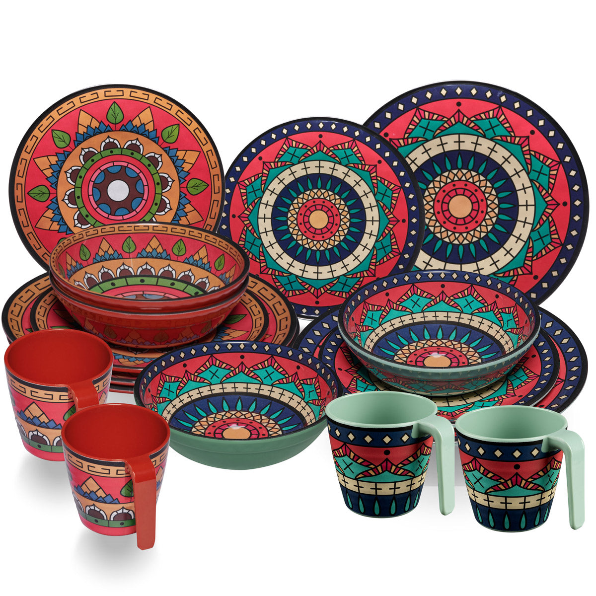 Melamin Geschirr Set Toskana Deep für 4 Personen - 16 Teile - Rot-Grün - Mandala-Optik Campingzubehör Campinggeschirr