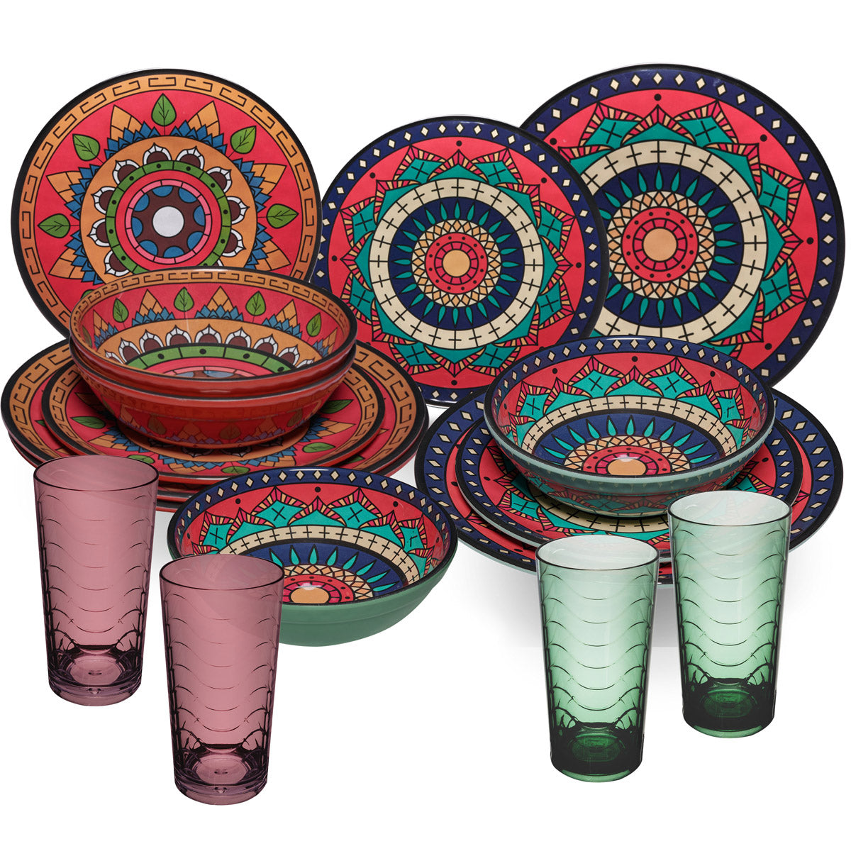 Melamin Geschirr Set Toskana Deep für 4 Personen - 16 Teile Rot-Grün - Mandala-Optik mit farblich passenden Trinkgläsern 260 ml Campinggeschirr