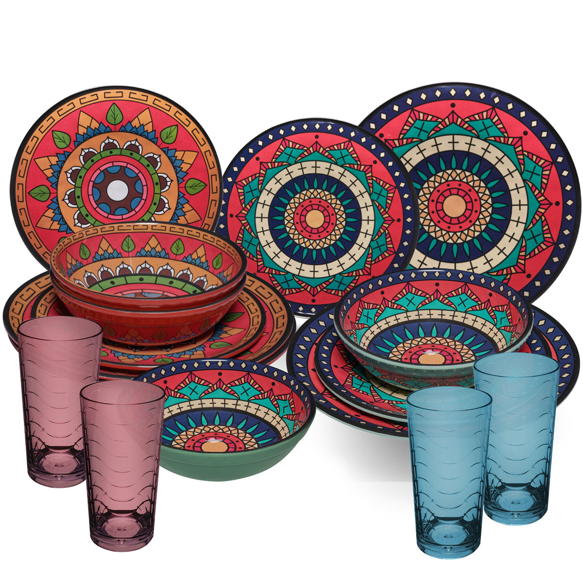 Melamin Geschirr Set Toskana Deep für 4 Personen - 16 Teile Rot-Grün - Mandala-Optik mit farblich passenden Trinkgläsern 260 ml Campinggeschirr