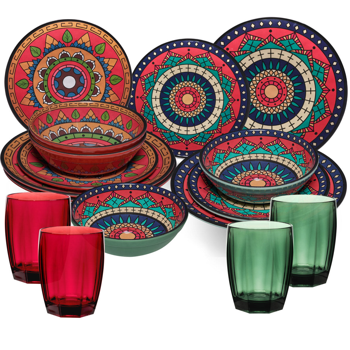 Melamin Geschirr Set Toskana Deep für 4 Personen - 16 Teile Rot-Grün - Mandala-Optik mit farblich passenden Trinkgläsern 320 ml Campinggeschirr