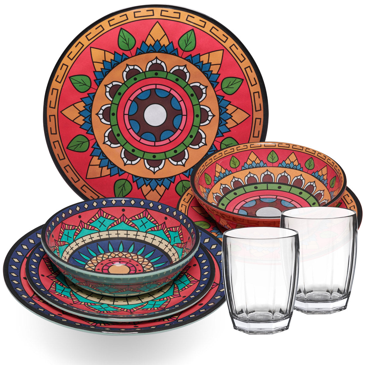 Melamin Geschirr Set Toskana Deep für 2 Personen - 8 Teile - Rot-Grün - Mandala-Optik mit klaren Trinkgläsern 320 ml Campinggeschirr