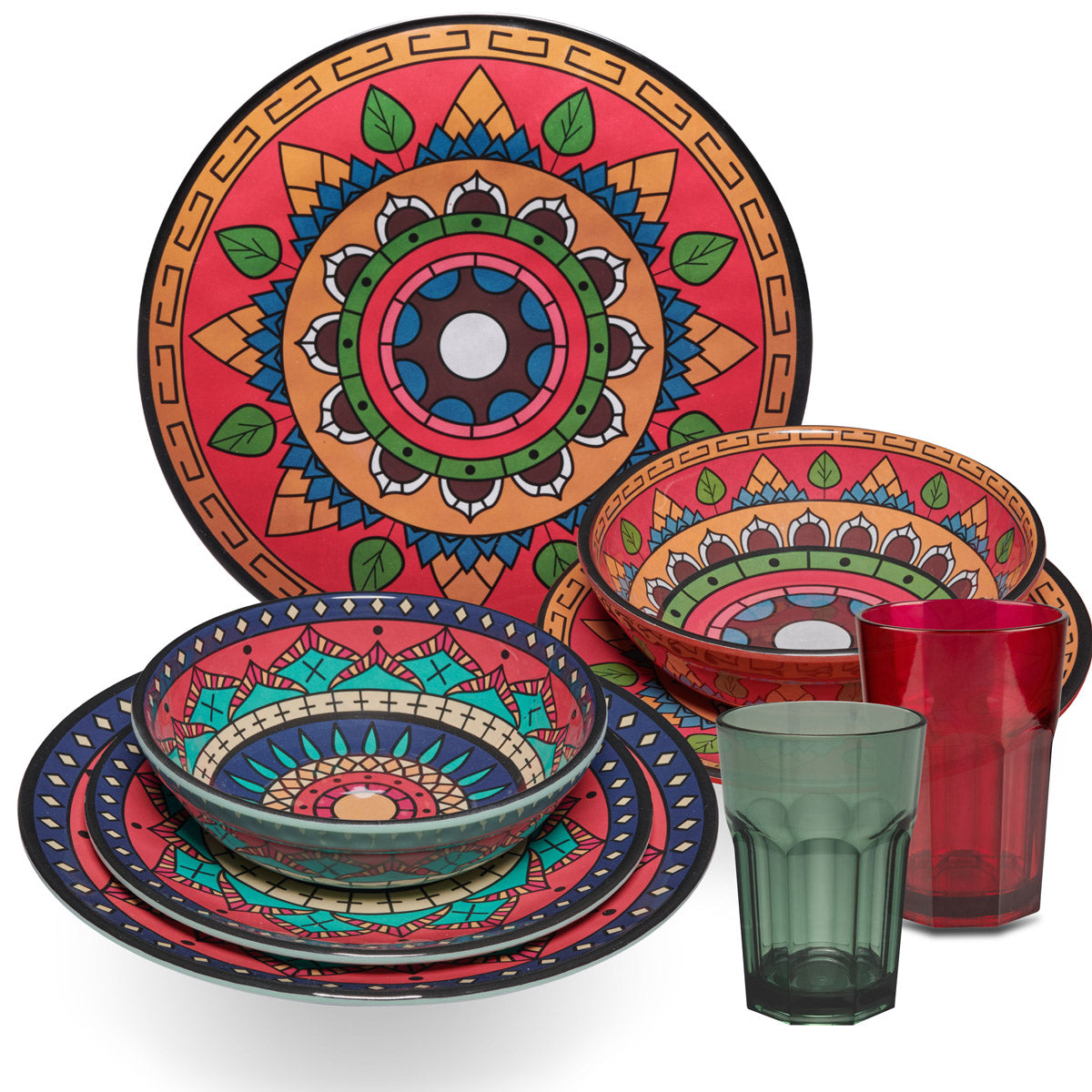 Melamin Geschirr Set Toskana Deep für 2 Personen - 8 Teile - Rot-Grün - Mandala-Optik mit farblich passenden Trinkgläsern 400 ml Campinggeschirr