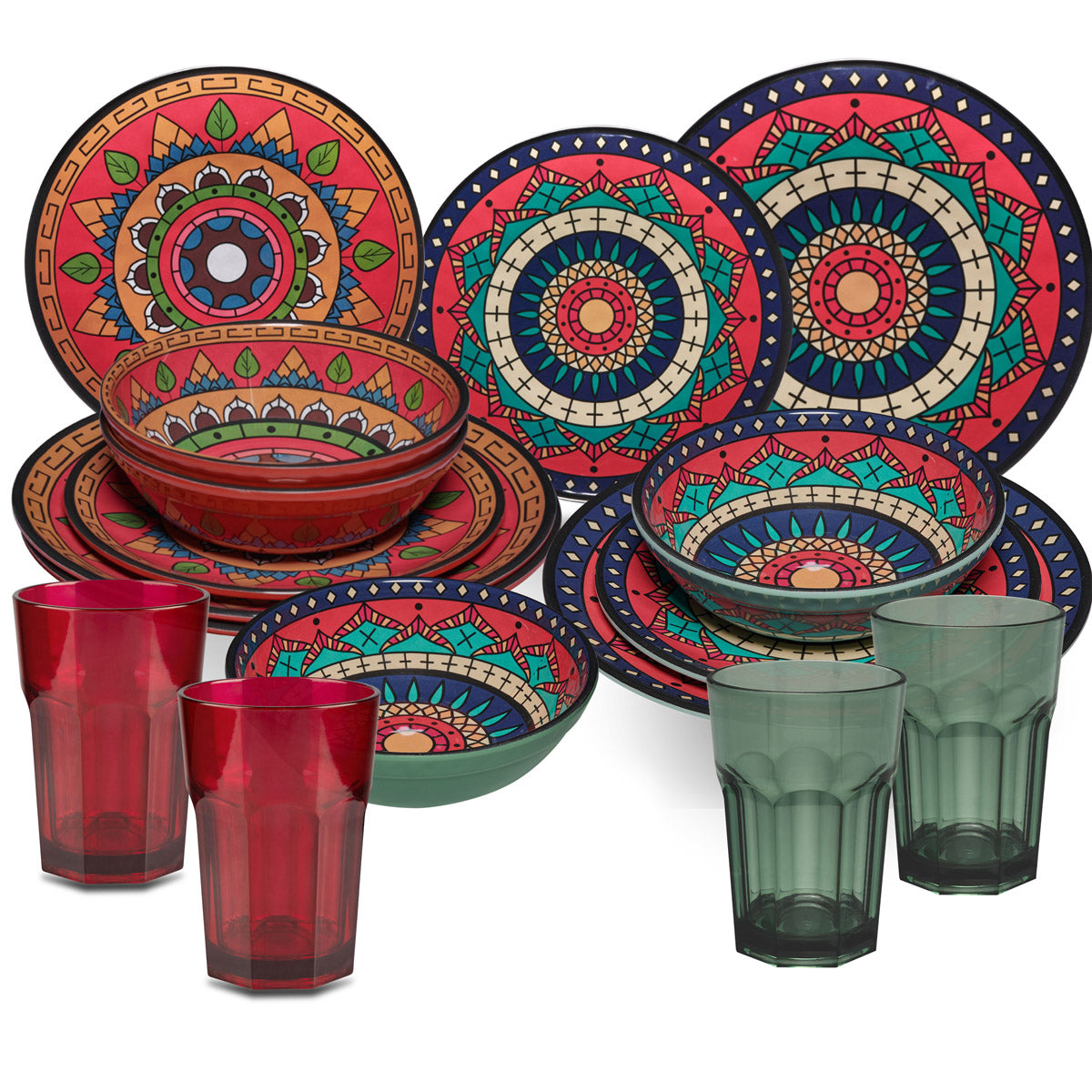 Melamin Geschirr Set Toskana Deep für 4 Personen - 16 Teile Rot-Grün - Mandala-Optik mit farblich passenden Trinkgläsern 400 ml Campinggeschirr