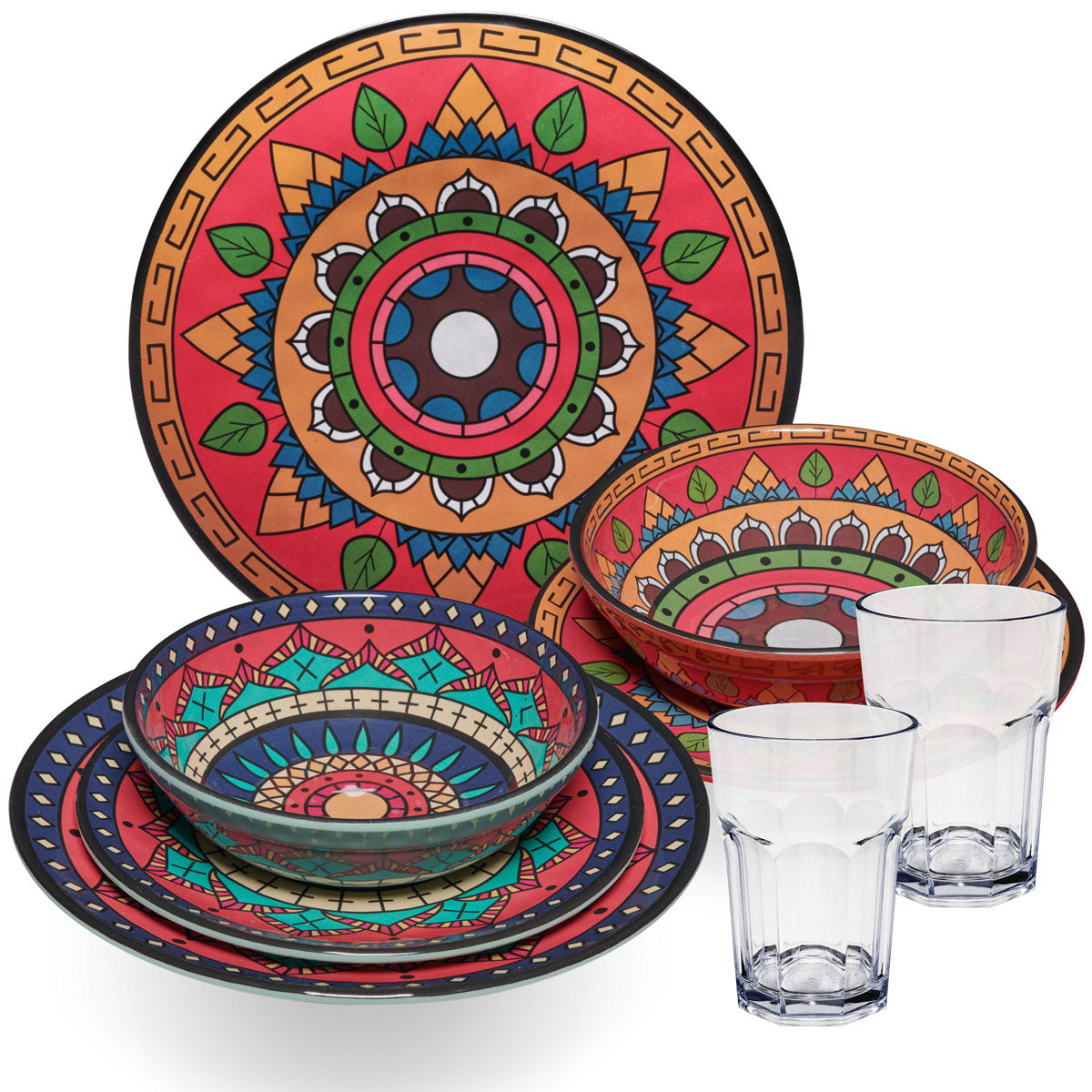 Melamin Geschirr Set Toskana Deep für 2 Personen - 8 Teile - Rot-Grün - Mandala-Optik mit klaren Trinkgläsern 400 ml Campinggeschirr