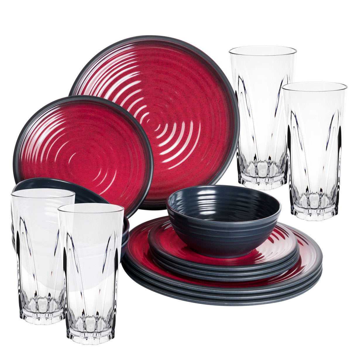Melamin Geschirr Set Rot für 4 Personen 16 Teile mit Trinkglas Klar Tonoptik - Essgeschirr Acryl Wasserglas - Campinggeschirr