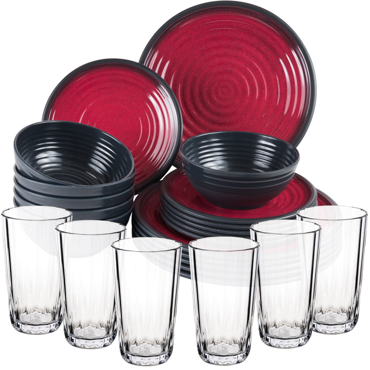 Melamin Geschirr Set Rot für 6 Personen 24 Teile mit Trinkglas klar Tonoptik - Essgeschirr Acryl Wasserglas - Campinggeschirr