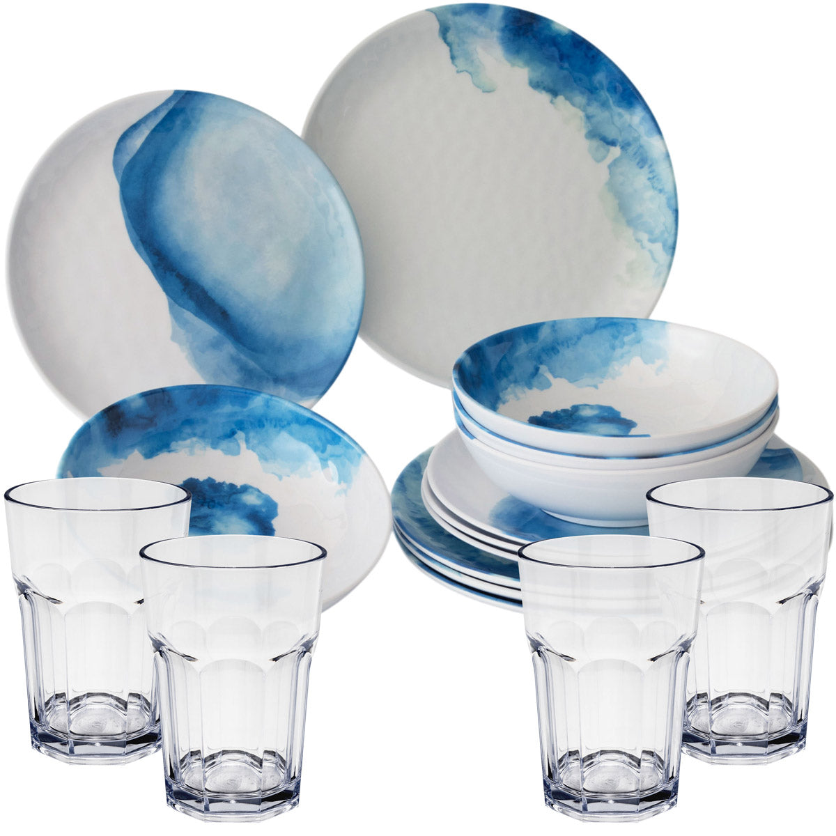 MELAMIN-GESCHIRRSET 16 TEILE FÜR 4 PERSONEN MIT TRINKGLÄSER 400ML IN KLAR: Deep Sea - Blautöne auf weißem Grundmaterial wie auf hoher See - Oberfläche uneben und wellig - ideal für...