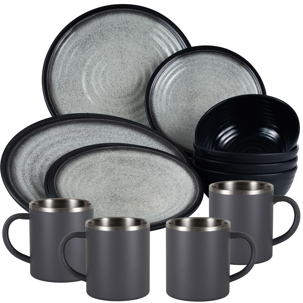 Melamin Geschirr Set Grau Schwarz für 4 Personen 16 Teile mit Edelstahl Thermo Tassen doppelwandig - Tonoptik Essgeschirr - Campinggeschirr Picknick ideal für Camping modern Outdoor