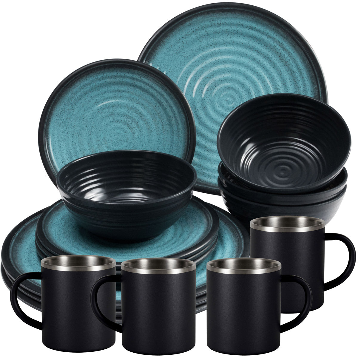 Melamin Geschirr Set Blau Schwarz für 4 Personen 16 Teile mit Edelstahl Thermo Tassen doppelwandig - Tonoptik Essgeschirr - Campinggeschirr Picknick ideal für Camping modern Outdoor