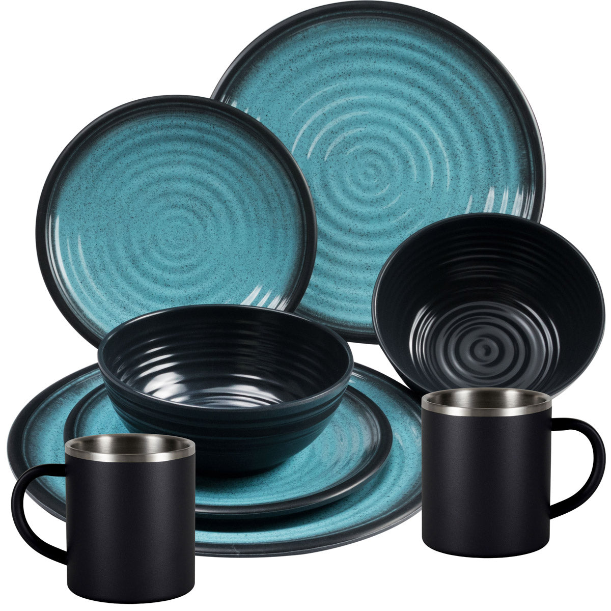 Melamin Geschirr Set Blau Schwarz für 2 Personen 8 Teile mit Edelstahl Thermo Tassen doppelwandig - Tonoptik Essgeschirr - Campinggeschirr Picknick ideal für Camping modern Outdoor