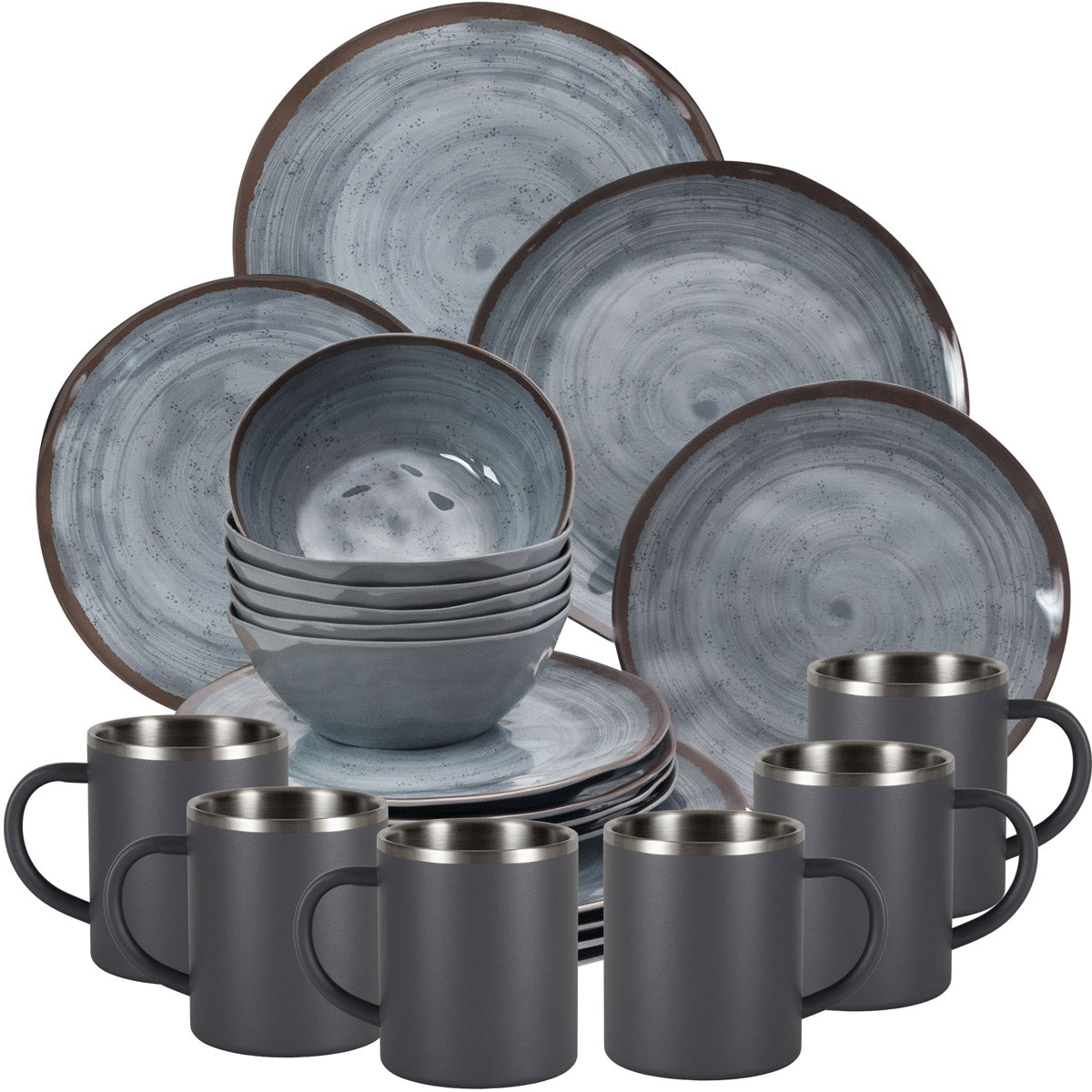 Melamin Geschirr Set Grau für 6 Personen 24 Teile mit Edelstahl Thermo Tassen doppelwandig - Tonoptik Essgeschirr - Campinggeschirr Picknick ideal für Camping modern Outdoor