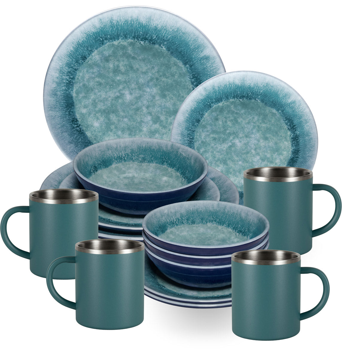 Melamin Geschirr Set Adria Blue für 4 Personen - 16 Teile Blau - mit Edelstahl Thermo Tassen Steingutoptik Essgeschirr Campingzubehör Campinggeschirr Wohnwagen Camping Festival Picknick Gartenparty