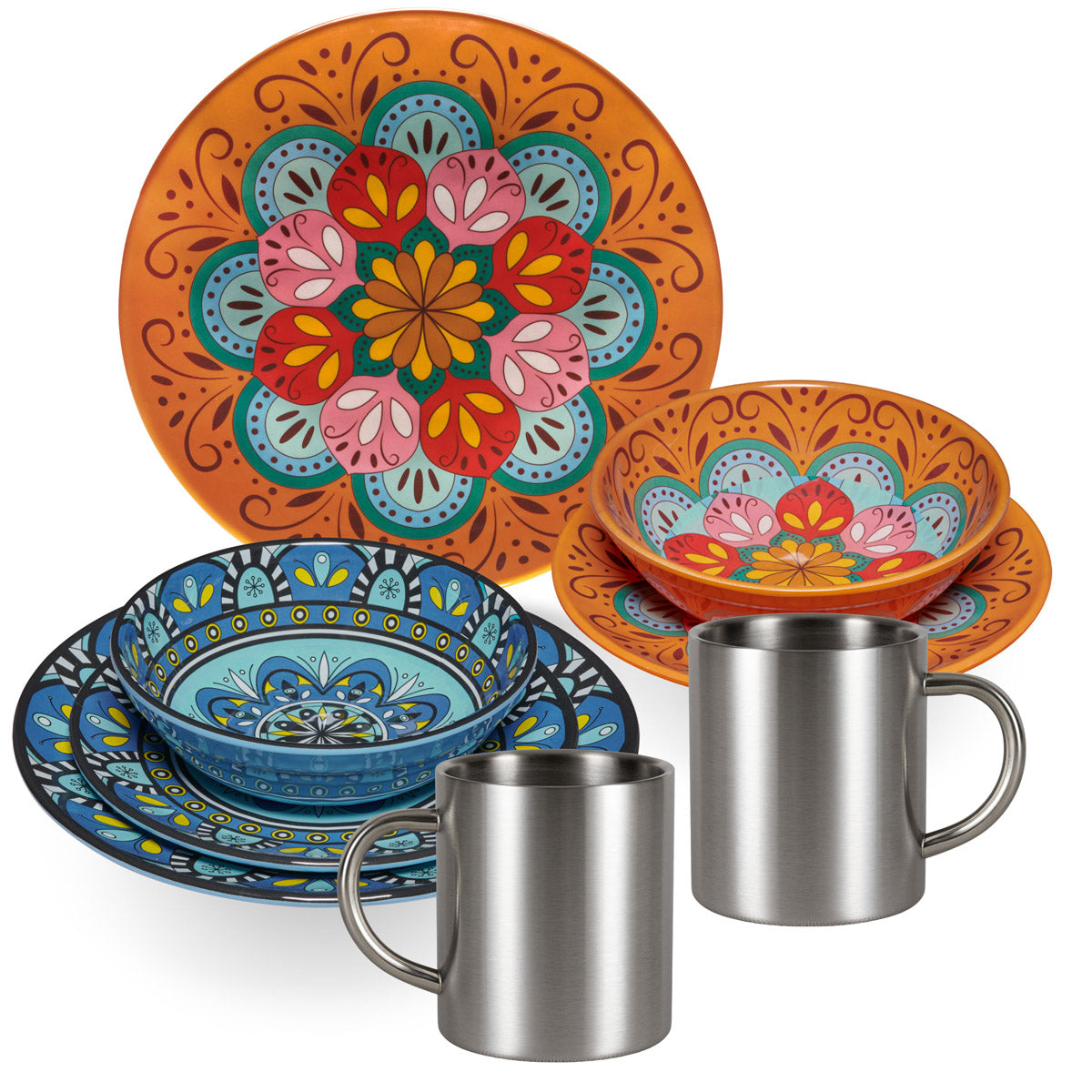 Melamin Geschirr Set Toskana Pastel für 2 Personen - 8 Teile - Orange-Blau - mit Edelstahltassen Mandala-Optik Spülmaschinengeeignet Essgeschirr Campingzubehör Campinggeschirr Wohnwagen Camping