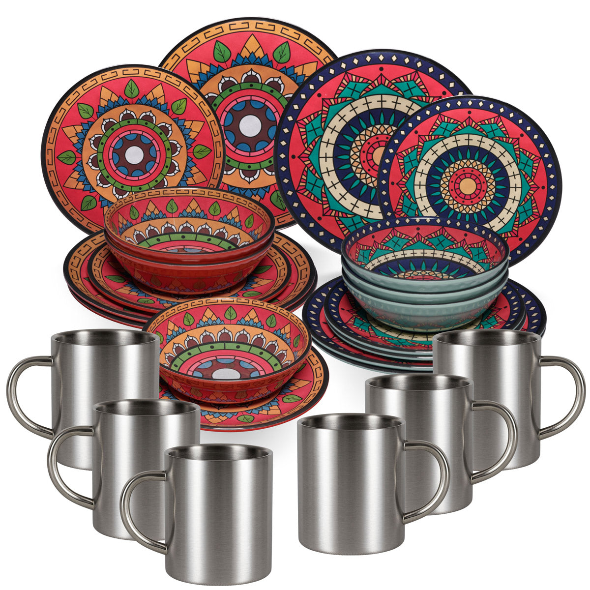 Melamin Geschirr Set Toskana Deep für 6 Personen - 24 Teile - Rot-Grün - mit Edelstahl Thermo Tassen Mandala-Optik Spülmaschinengeeignet Essgeschirr Campingzubehör Campinggeschirr Wohnwagen Camping