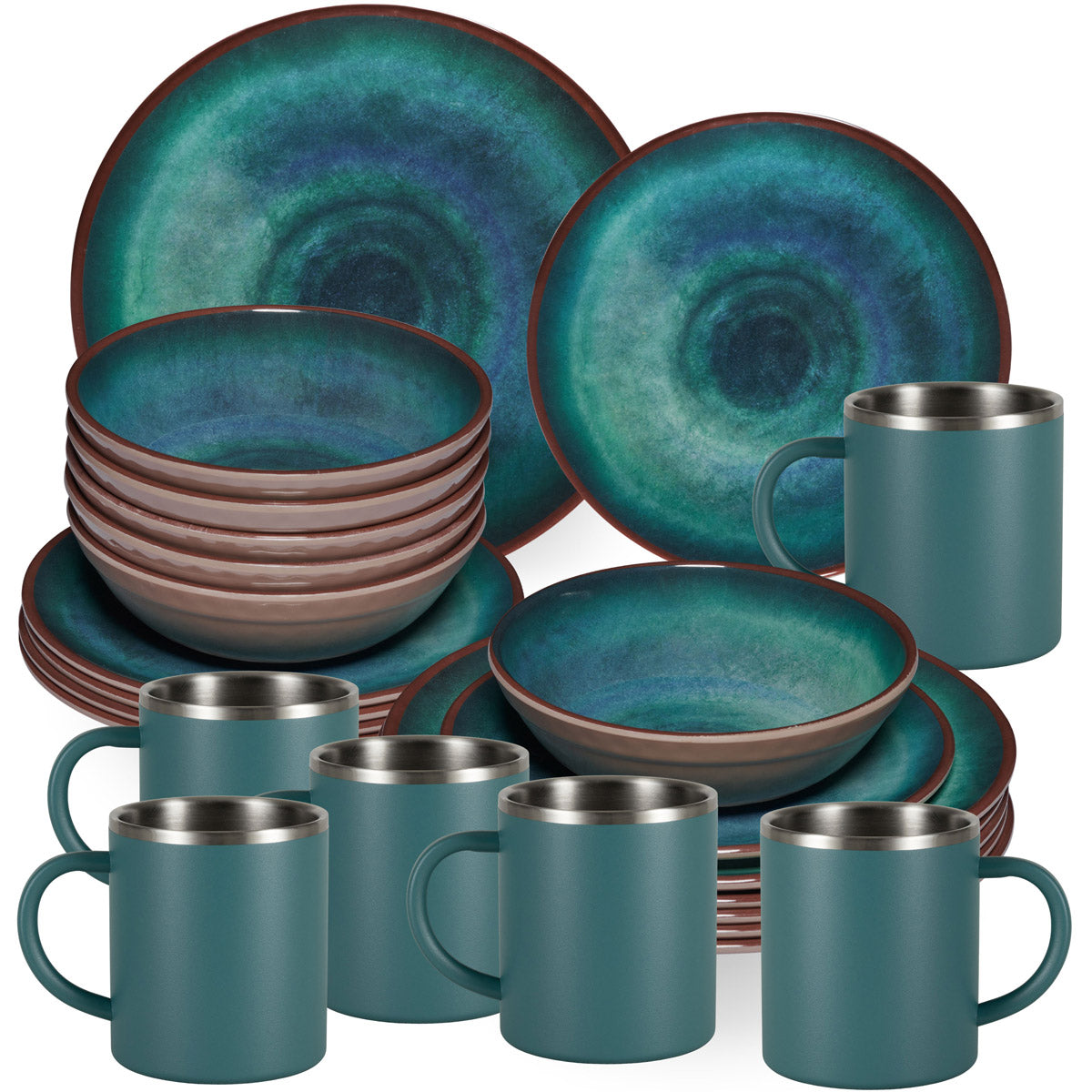Melamin Geschirr Set Jesolo Grün für 6 Personen - 24 Teile mit Edelstahltassen Steingutoptik Spülmaschinengeeignet Campinggeschirr Wohnwagen Camping Festival