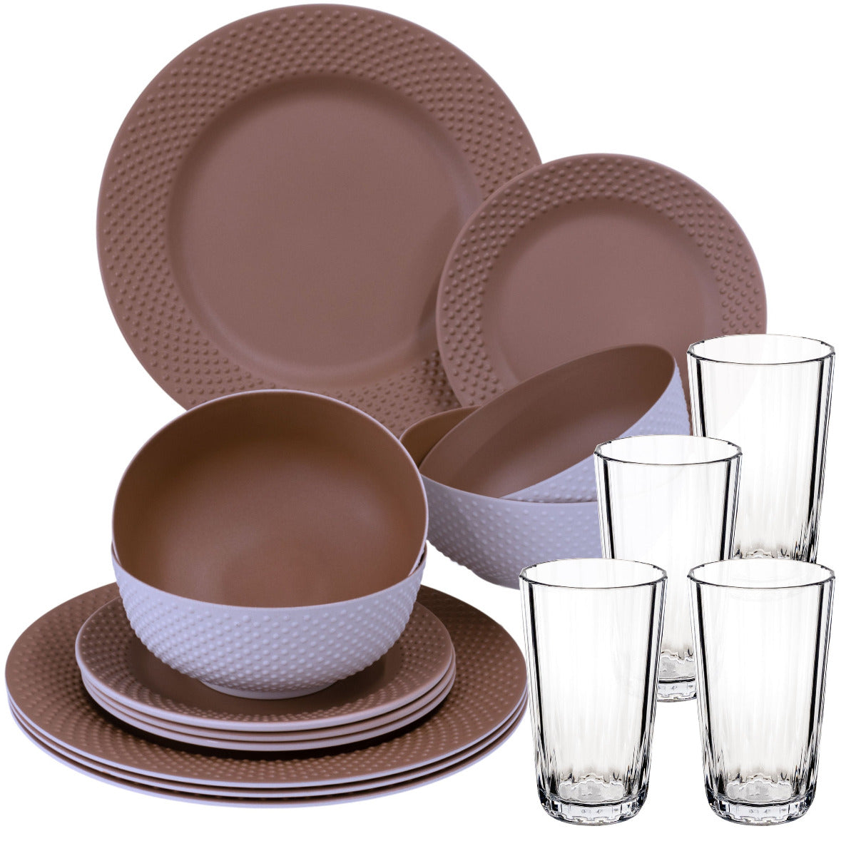 MELAMIN-GESCHIRRSET FÜR 4 PERSONEN 16 TEILE MIT KLAREM TRINKGLAS 300 ML: BLUSH - Geschirr im warmen Rosé-Ton - strukturierter Rand mit kleinen erhabenen Punkten - klare Trinkgläser - ideal für Camping, Outdoor, Picknick oder...