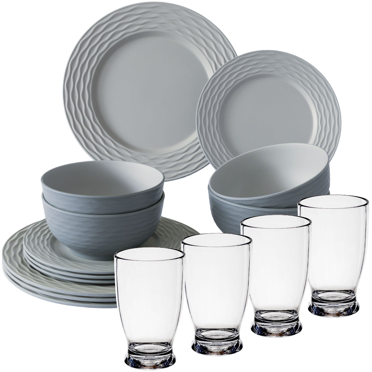 MELAMIN-GESCHIRRSET FÜR 4 PERSONEN 16 TEILE MIT KLAREM TRINKGLAS 380 ML: RIPPLE Sand - Geschirr im Grau-Ton - strukturierter Rand mit sanft geschwungenem Wellenmuster - klare Trinkgläser - ideal für Camping, Outdoor, Picknick oder Festival GESCHIRR:...