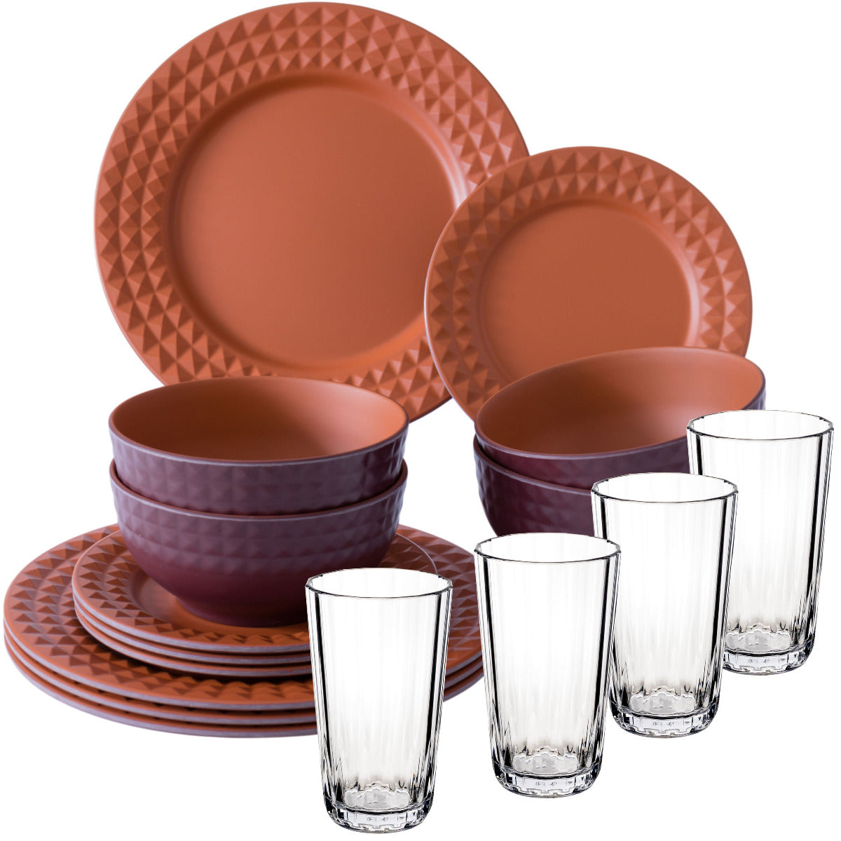 MELAMIN-GESCHIRRSET FÜR 4 PERSONEN 16 TEILE MIT KLAREM TRINKGLAS: Viva Terra - Geschirr im kräftigen Terrakotta-Orange und außen in einem dunkleren Rotbraunton - Rand mit einem geometrischen, pyramidenförmigen Verziehrung - klare Trinkgläser - ideal für...