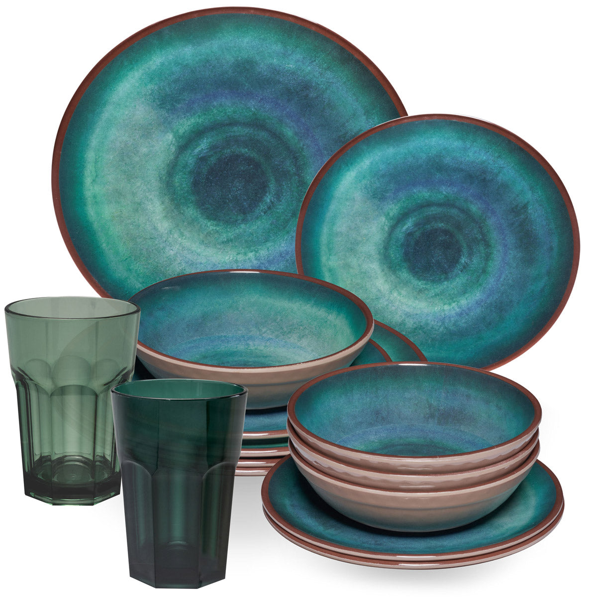 Melamin Geschirr Set Jesolo Grün für 2 Personen - 8 Teile - mit farblich passenden Trinkgläsern 400ml aus Acryl Campinggeschirr Geschirrset Tafelgeschirr Camping modernes Melamingeschirr bunt