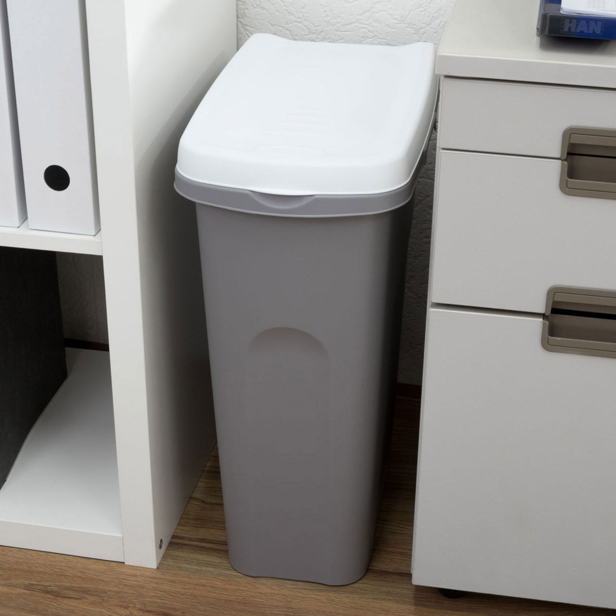 SCHMALER MÜLLEIMER 25 LITER GRAU MIT DECKEL: 1 Eimer 25 Liter mit Klapp-Deckel - rechteckig - schmal - Maße: ca. 39 x 24 x 51 cm (TxBxH) - Gewicht: ca. 980 g - Material: 100% Polypropylen - Lebensmittelgeeignet - Müllbeutel-Halterungsbügel