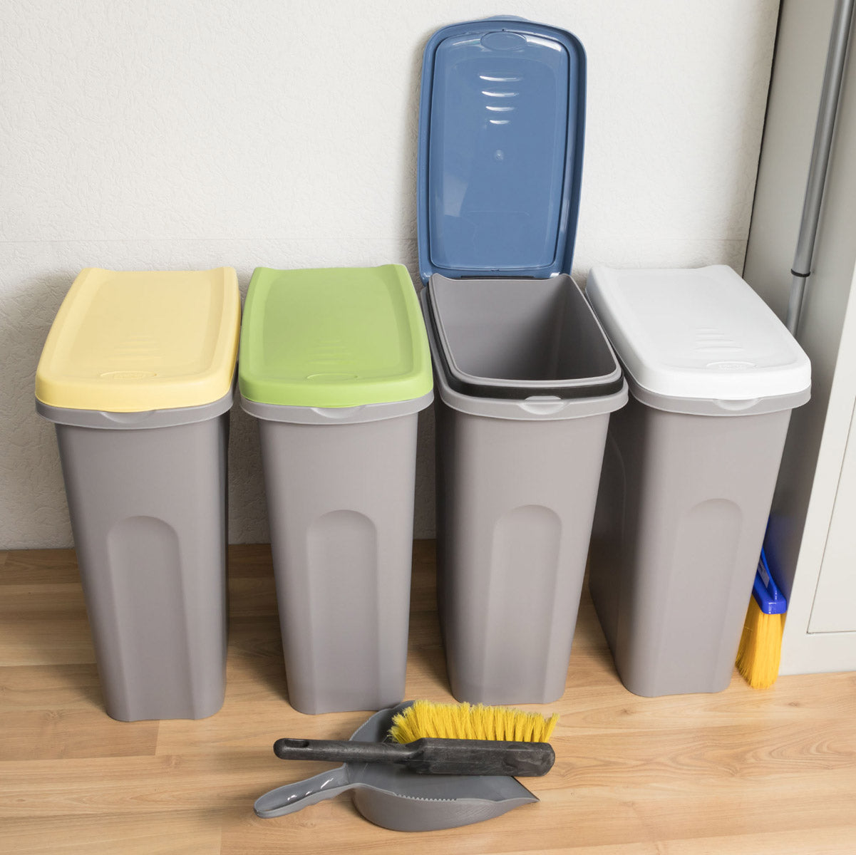 VIERFACH-MÜLLEIMER SCHMAL 25 LITER GRAU MIT GELBEM, BLAUEM, GRÜNEM UND WEIßEM DECKEL: 4 Eimer zu je 25 Liter mit gelbem, blauem, grünem und weißem Klapp-Deckel - rechteckig - schmal - Maße: je Eimer ca. 39 x 24 x 51 cm (TxBxH) - Gewicht: je Eimer ca. 980 g - Material: 100% Polypropylen - Lebensmittelgeeignet - Müllbeutel-Halterungsbügel