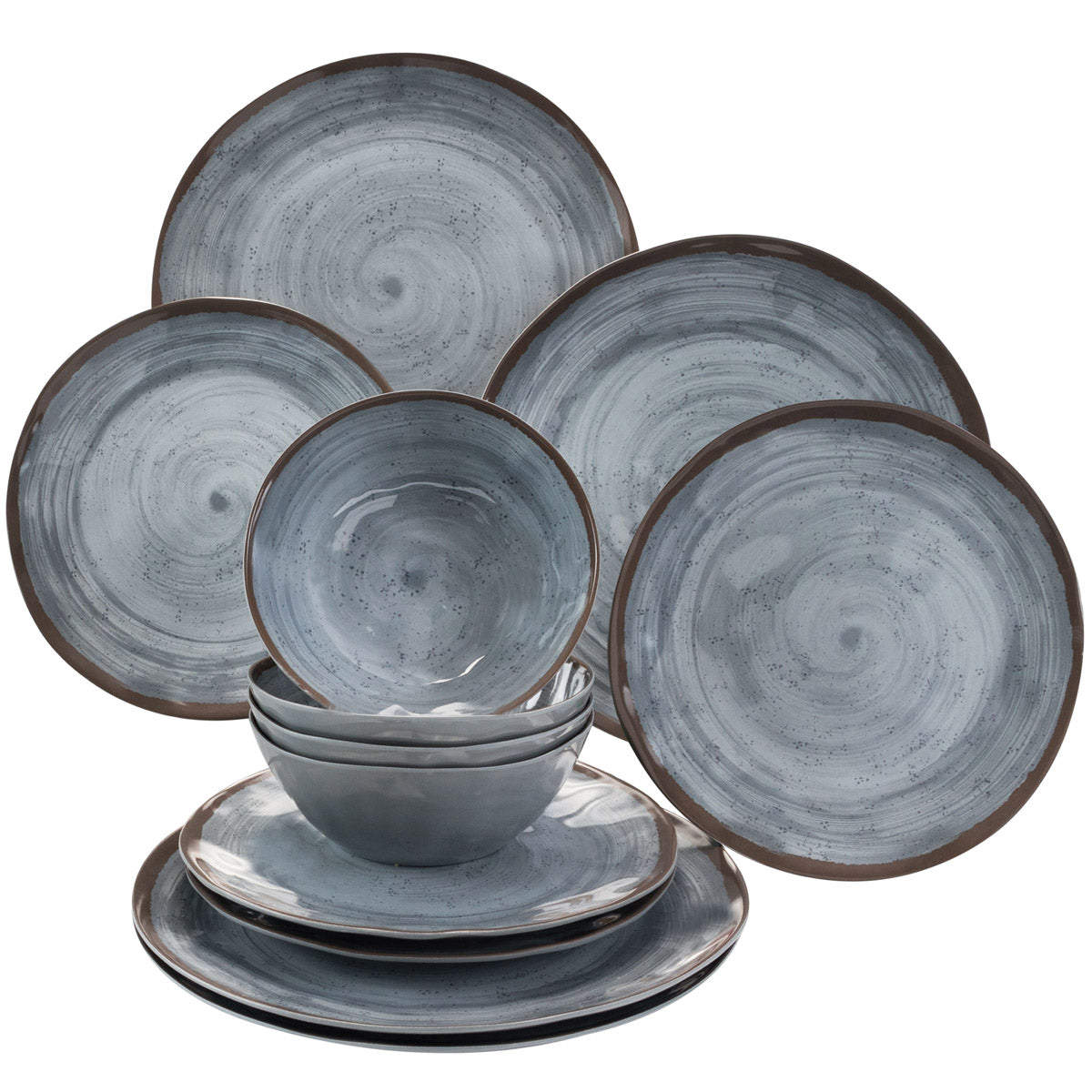 Camping Geschirr aus Melamin 12-teilig für 4 Personen, Steingutoptik, Design Halo, grau Spülmaschinenfest, Bruchsicher