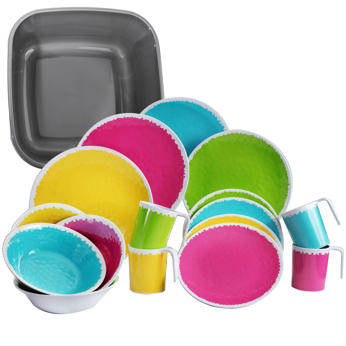 Melamin Geschirr für 4 Personen in BUNTEN Farben 17 Teile MIT SPÜLSCHÜSSEL ideal für Camping - mit je 4 großen Teller, 4 Dessertteller, 4 Schälchen, 4 stapelbare Tassen - sehr robust - farbecht