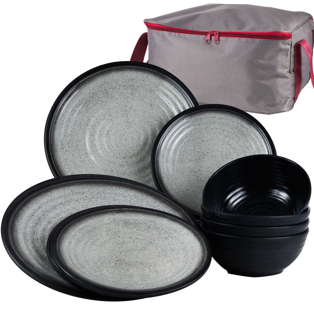Melamin Geschirr Set für 4 Personen Grau Granit-Optik 13 Teile - mit Aufbewahrungstasche - Campinggeschirr Geschirrset Tafelgeschirr - Spülmaschinengeeignet Outdoor Camping Reißverschluß Tasche