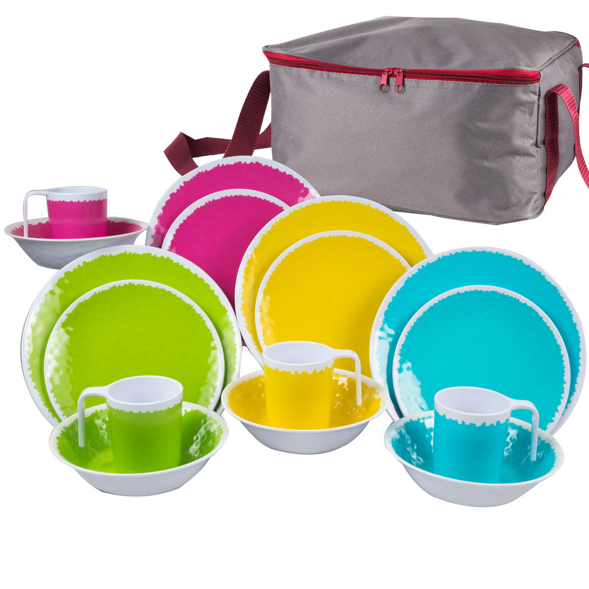 Melamin Geschirr Set Bunt 17 Teile mit Aufbewahrungstasche - 4 Personen Essgeschirr Campinggeschirr Picknick für Camping Teller Schüssel Schale Melamingeschirr Tafelgeschirr mit Reißverschluß Tasche