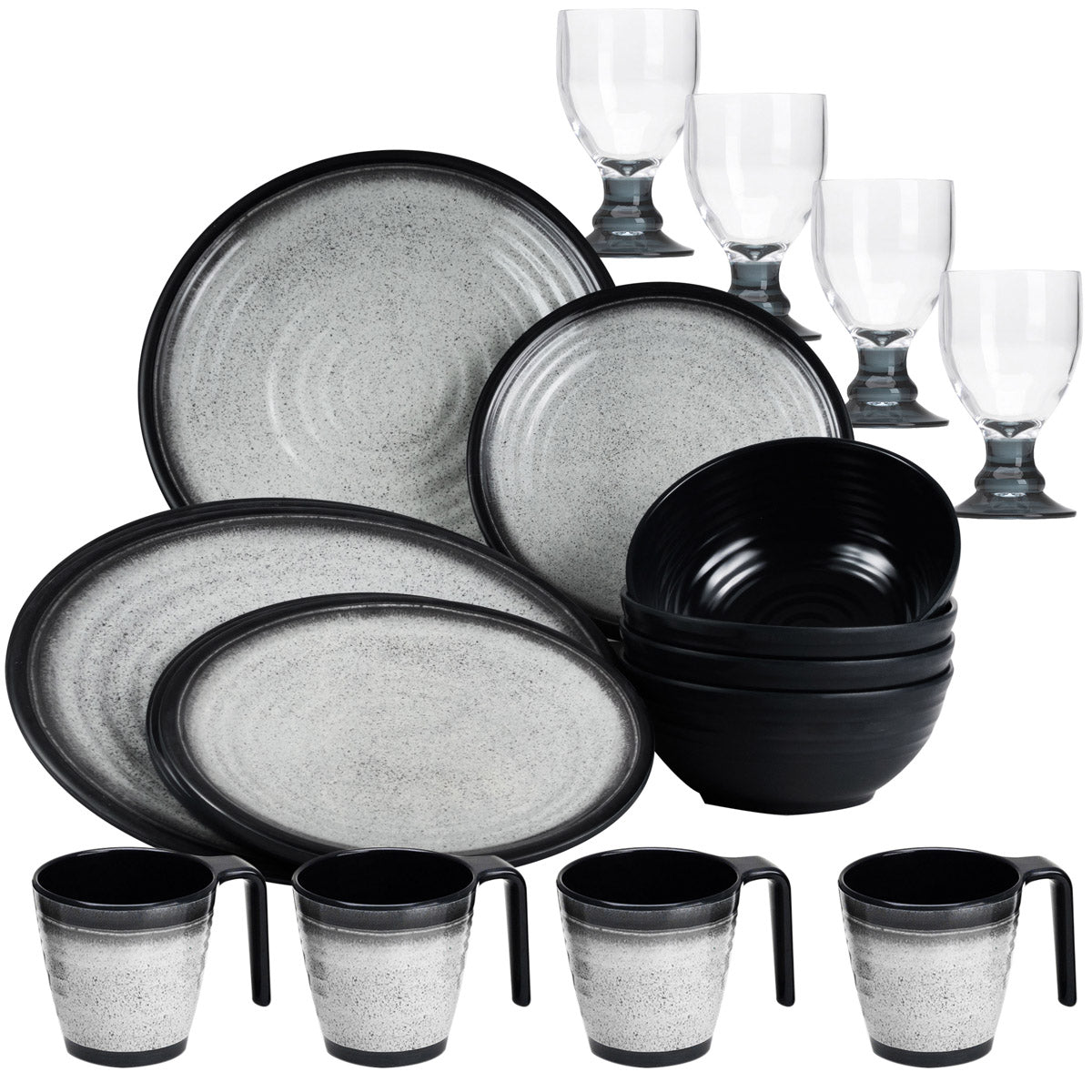 Melamin Geschirr Set für 4 Personen Grau Granit-Optik 20 Teile - mit Stapeltassen und grauen Trinkgläsern 410 ml - Campinggeschirr Geschirrset