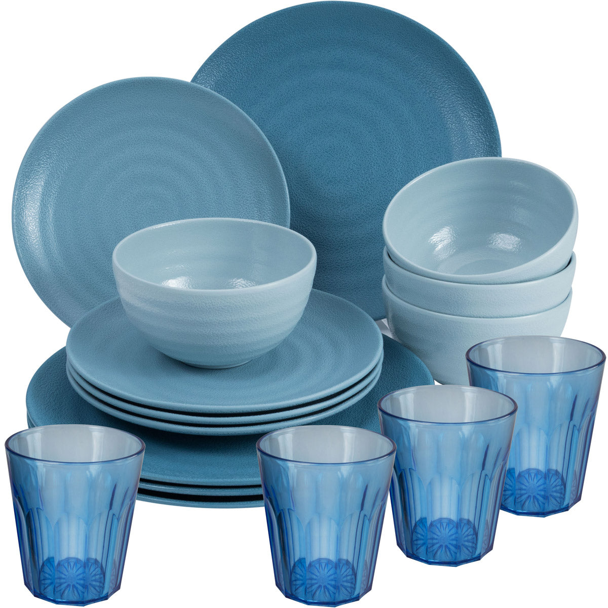 Melamin Geschirr Set für 4 Personen - 16 Teile - mit Trinkgläsern - Campinggeschirr blau Geschirrset Tafelgeschirr Camping