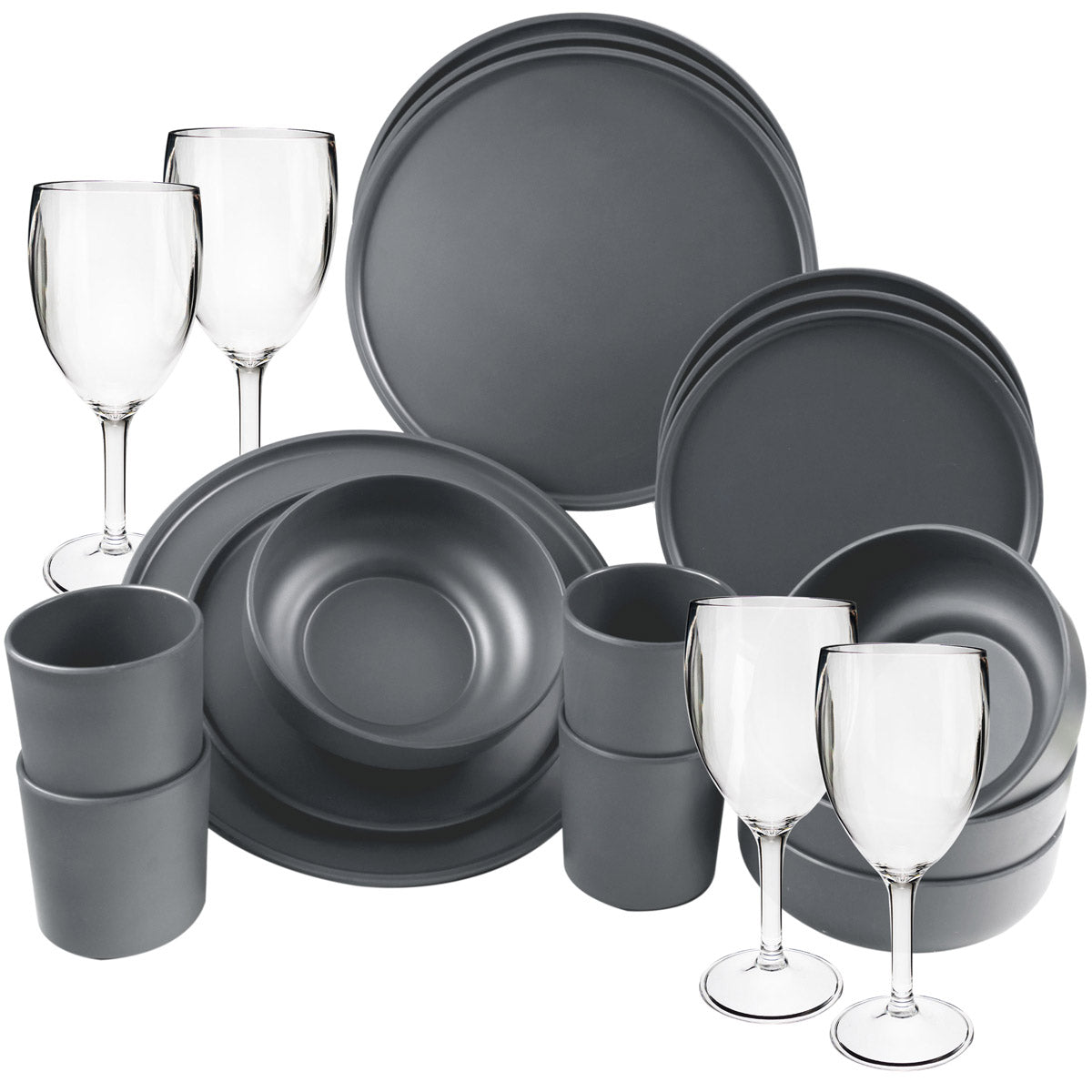 Melamin Geschirr Set für 4 Personen - 20 Teile - grau - mit Bechern und Weingläsern - Campinggeschirr Camping Geschirr