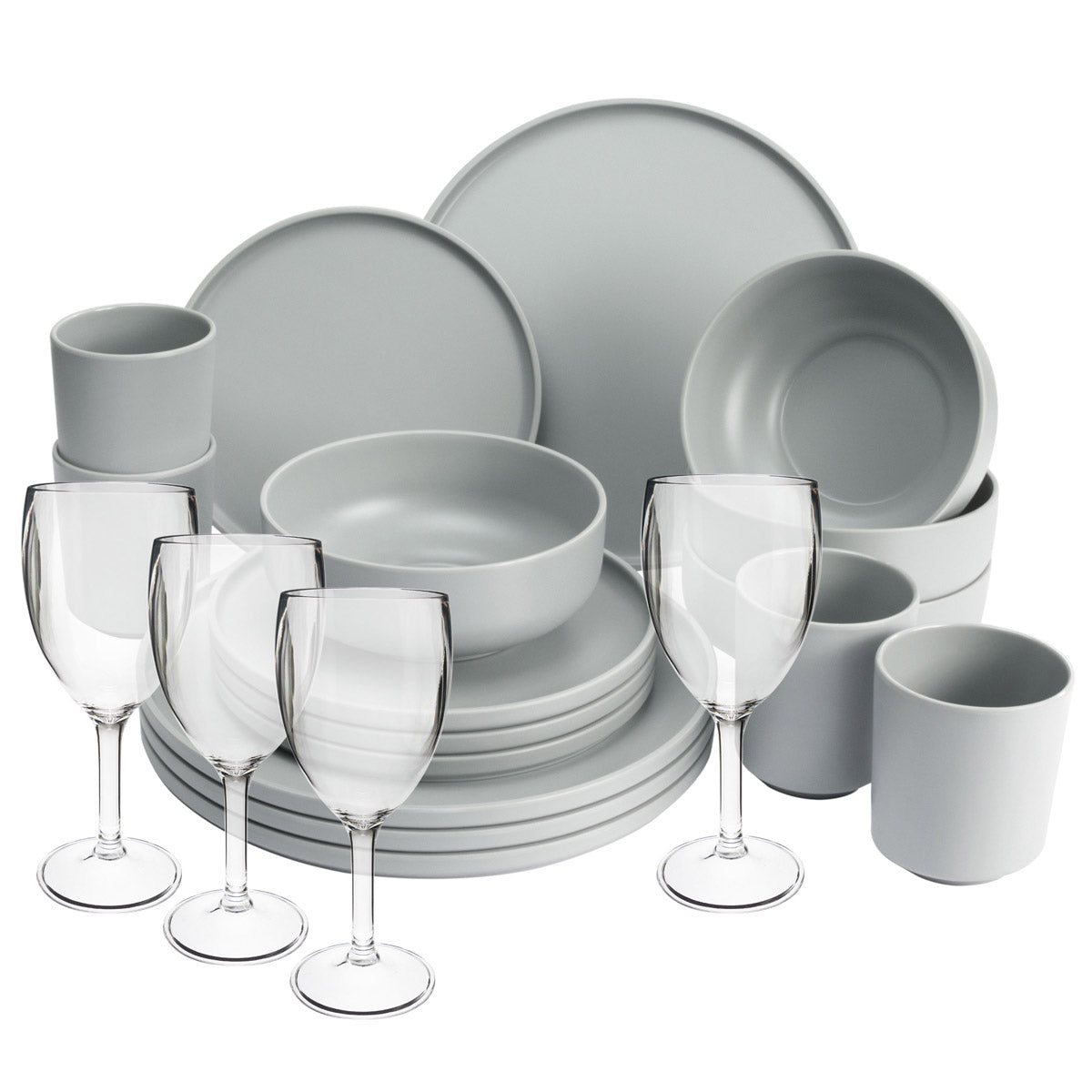 Melamin Geschirr Set mit steilem Rand für 4 Personen - 20 Teile - Campinggeschirr mit Weinglas - grau - Essgeschirr