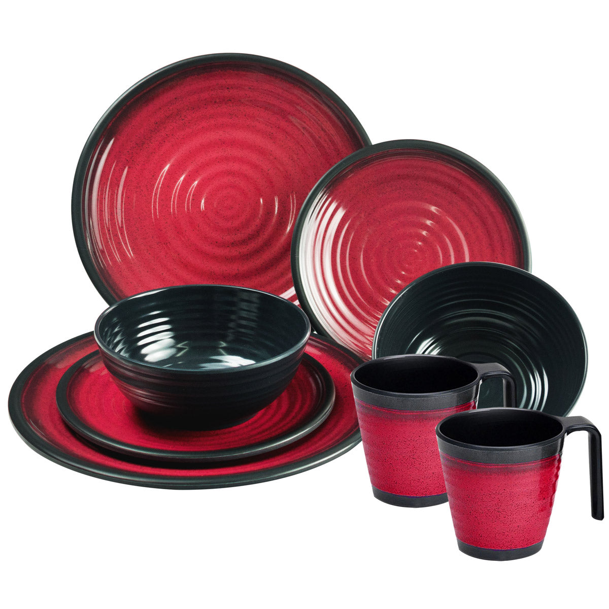 MELAMIN GESCHIRRSET 8 TEILE FÜR 2 PERSONEN MIT STAPELBAREN TASSEN IN ROT:  Steingut-Optik in Rottönen auf schwarzem Grundmaterial - Oberfläche uneben und wellig - ideal für Camping, Outdoor, Picknick oder...