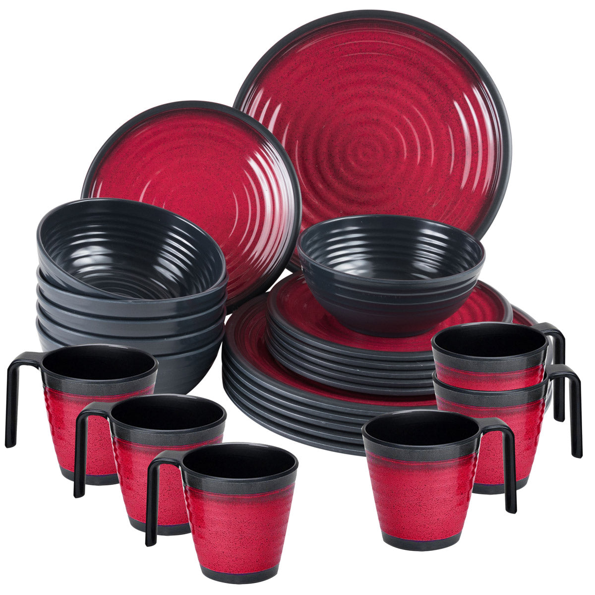 Melamin Camping Geschirr Set für 6 Personen - mit Tellern und Stapeltassen - 24 Teile - Rot-Schwarz | Steingut Optik Campinggeschirr