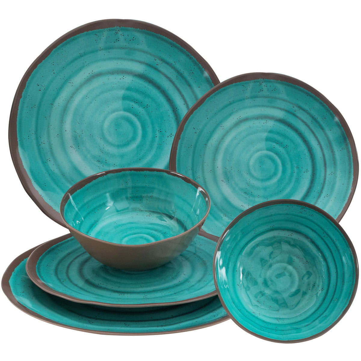 Melamin Geschirr Set für 2 Personen Steingut Optik aqua-grün 6 Teile - mit Tellern und Schüsseln - Campinggeschirr
