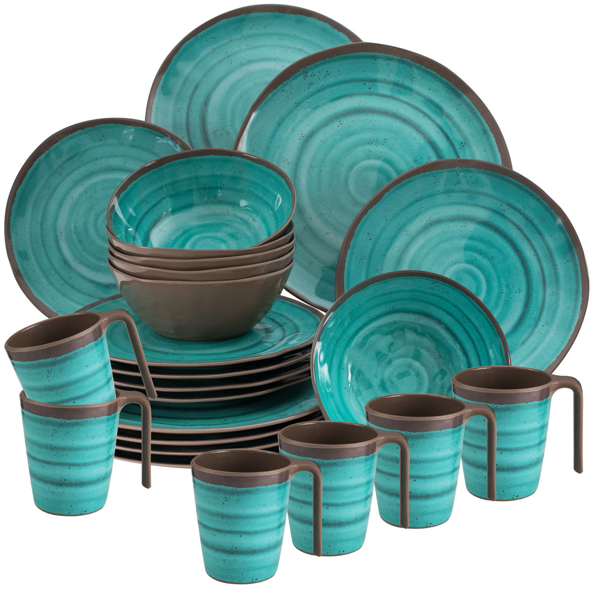Melamin Geschirr Set für 6 Personen Steingut Optik grün-braun 24 Teile - mit Tellern und Tassen - Campinggeschirr