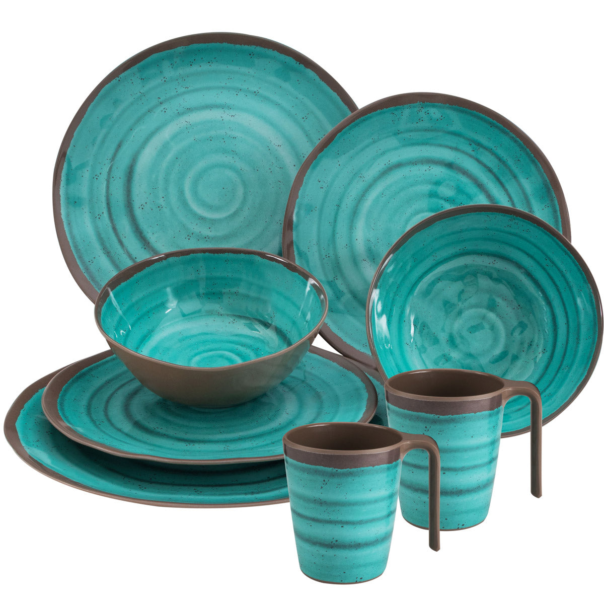 Melamin Geschirr Set für 2 Personen Steingut Optik grün-braun 8 Teile - mit Tellern und Tassen - Campinggeschirr