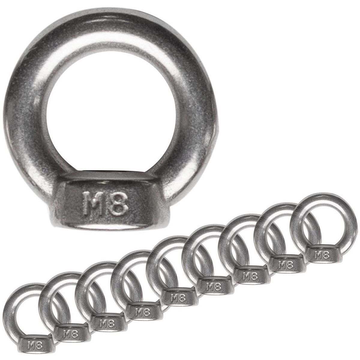 10 Edelstahl M8 Ringmutter V2A 304 - Ösenmutter Augenmutter Ringösen Traglast 350 kg Heberingmutter Hebering Loch für Kabelseil Eye nut