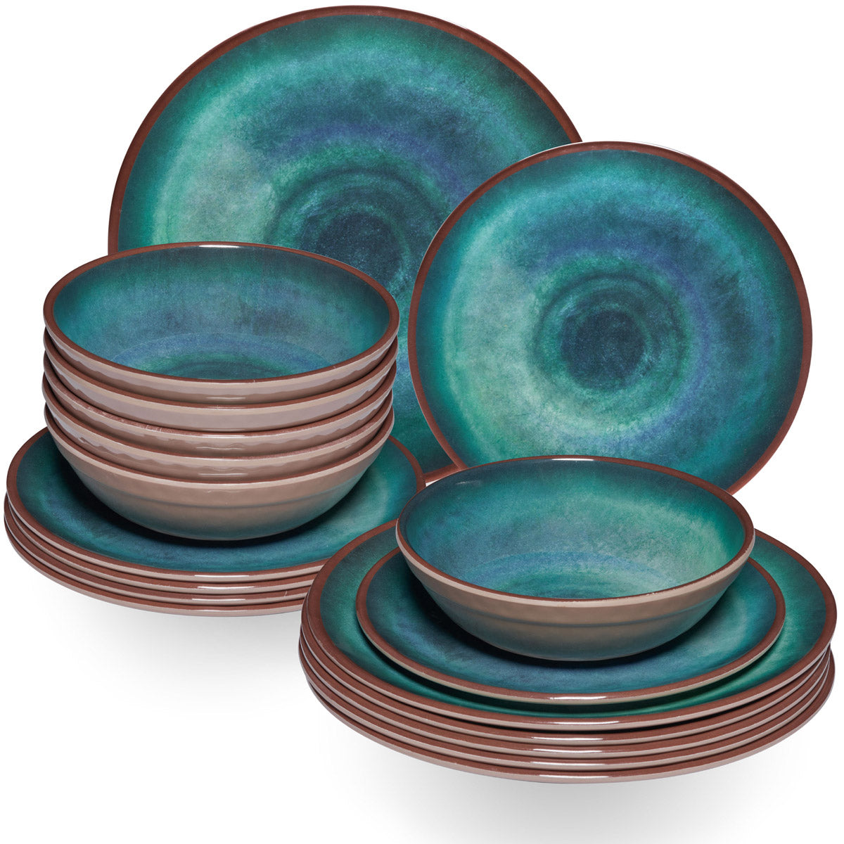 MELAMIN GESCHIRRSET 18 TEILE FÜR 6 PERSONEN: Jesolo Grün - Steingut-Optik in Grüntönen mit Terracotta - Oberfläche uneben und wellig - ideal für Camping, Outdoor, Picknick oder Festival 18 TEILE:...
