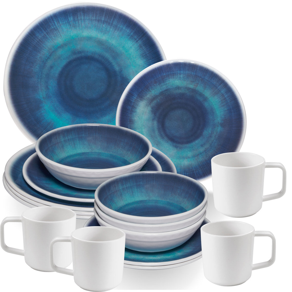 Melamin Geschirr Set Jesolo Blau für 4 Personen - 16 Teile - mit 90°C-Tassen aus ABS-Kunstsoff mit Antislip-Funktion - Steingutoptik Campinggeschirr