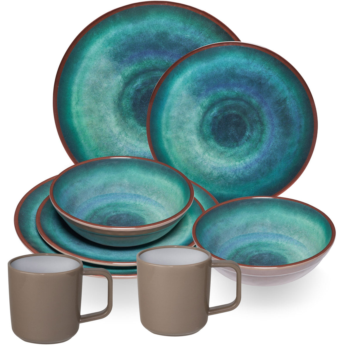 MELAMIN GESCHIRRSET 8 TEILE FÜR 2 PERSONEN MIT HOT-MUG TASSEN: Jesolo Grün - Steingut-Optik in Grüntönen auf Terracotta Grundmaterial - braune Hot-Mug Tassen aus ABS-Kunststoff bis 90°C und Antislip-Funktion -...