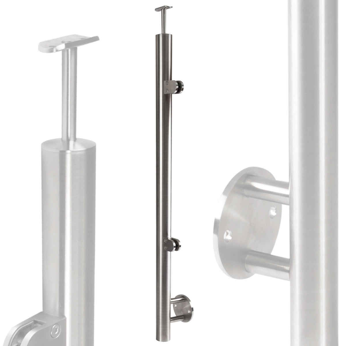 Edelstahl Geländerpfosten Endpfosten rechts mit Glashalter 8,76mm und Handlauf-Träger - 42,4mm - Wangemontage V2A - seitliche Montage vormontiert - Glasgeländer Geländerstützen Pfosten Zaunpfosten aussen