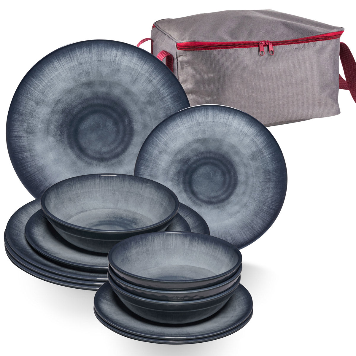 Melamin Geschirr Set Jesolo Grau für 4 Personen - 13 Teile - mit Aufbewahrungstasche Steingutoptik - Campinggeschirr Camping