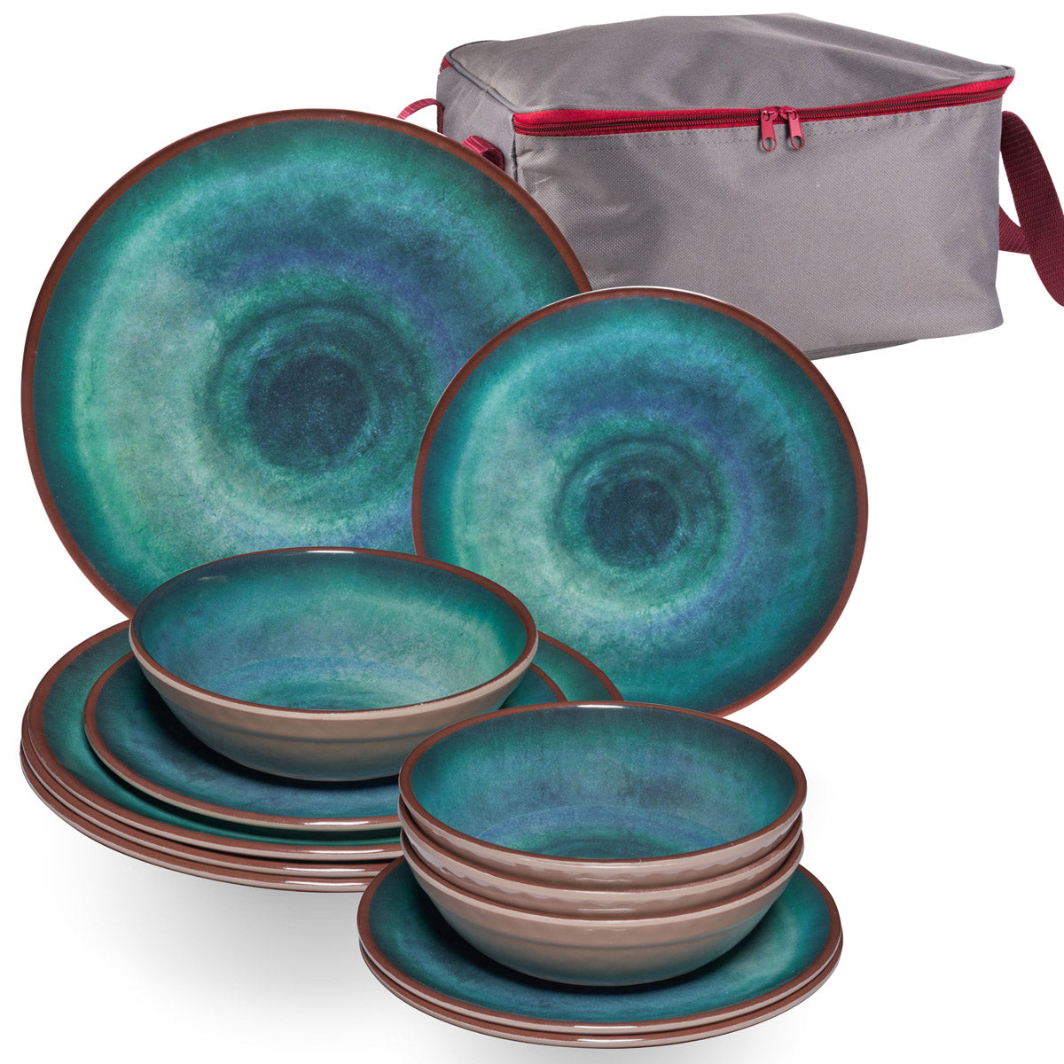 Melamin Geschirr Set Jesolo Grün für 4 Personen - 13 Teile - mit Aufbewahrungstasche Steingutoptik Spülmaschinengeeignet - Essgeschirr Campingzubehör Campinggeschirr Wohnwagen Camping