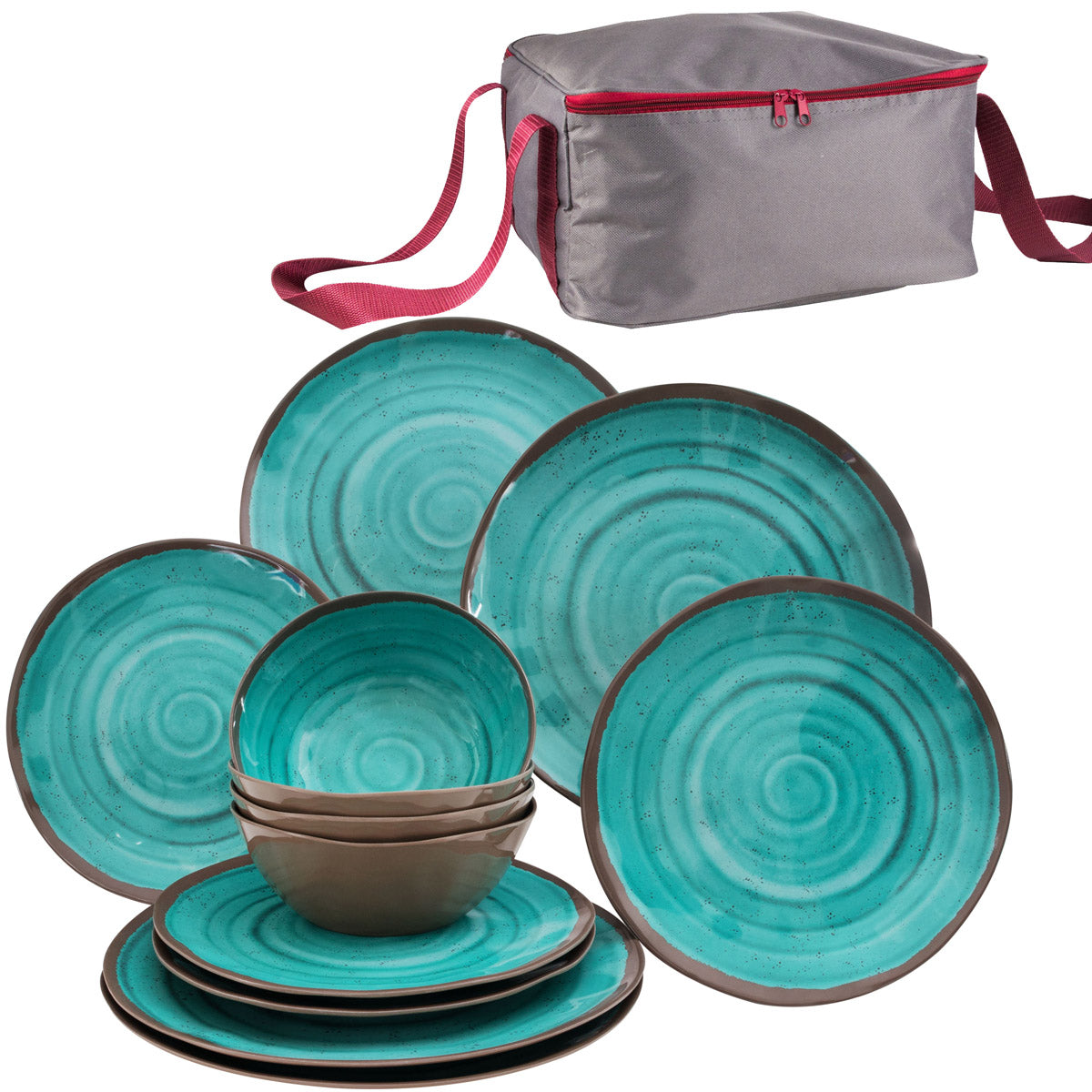 Camping Geschirr aus Melamin 13 Teile für 4 Personen Steingutoptik grün - mit Aufbewahrungstasche Steingutoptik Spülmaschinengeeignet - Essgeschirr Campingzubehör Campinggeschirr Wohnwagen Camping